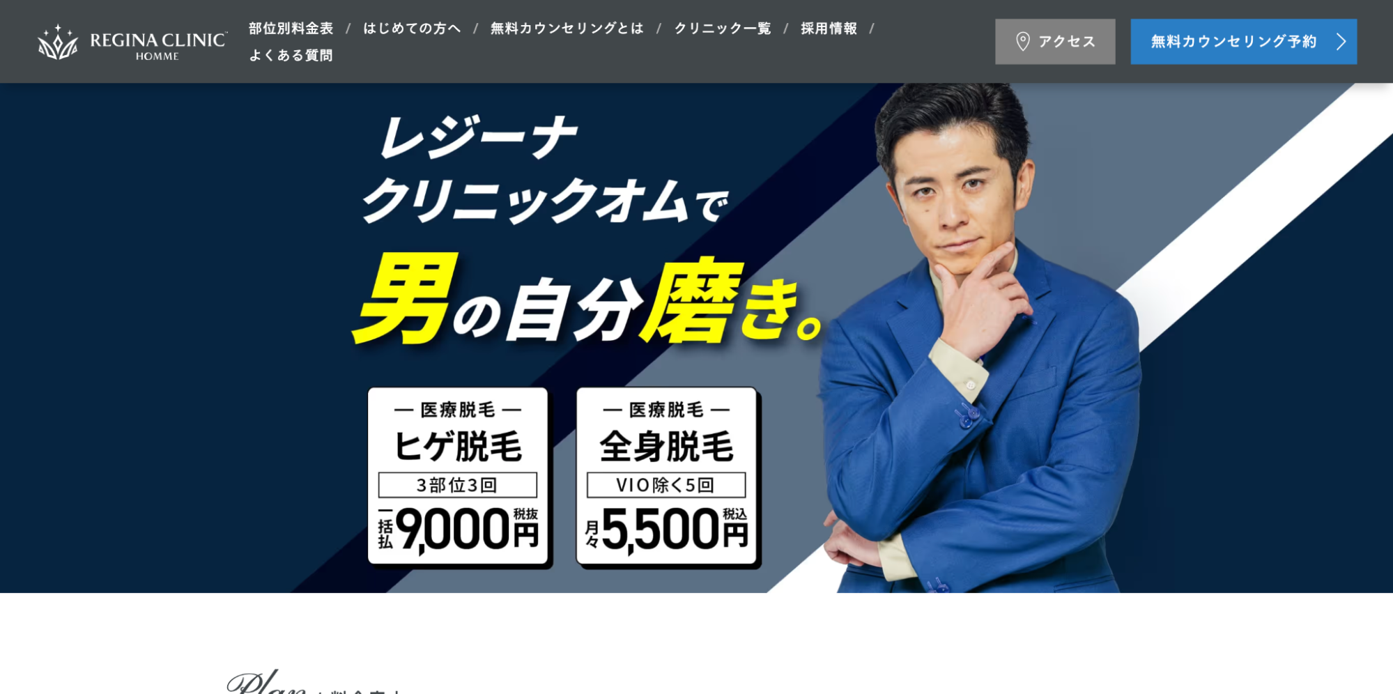 レジーナクリニックオムは、メンズ脱毛ができる男性専用の医療脱毛クリニックです。ヒゲ脱毛だけでなく、全身やVIO脱毛が可能で、男性の悩みを解消できる脱毛プランが揃っています。肌を冷やしながらレーザーを照射するため、痛みを緩和させながらの施術が可能です。