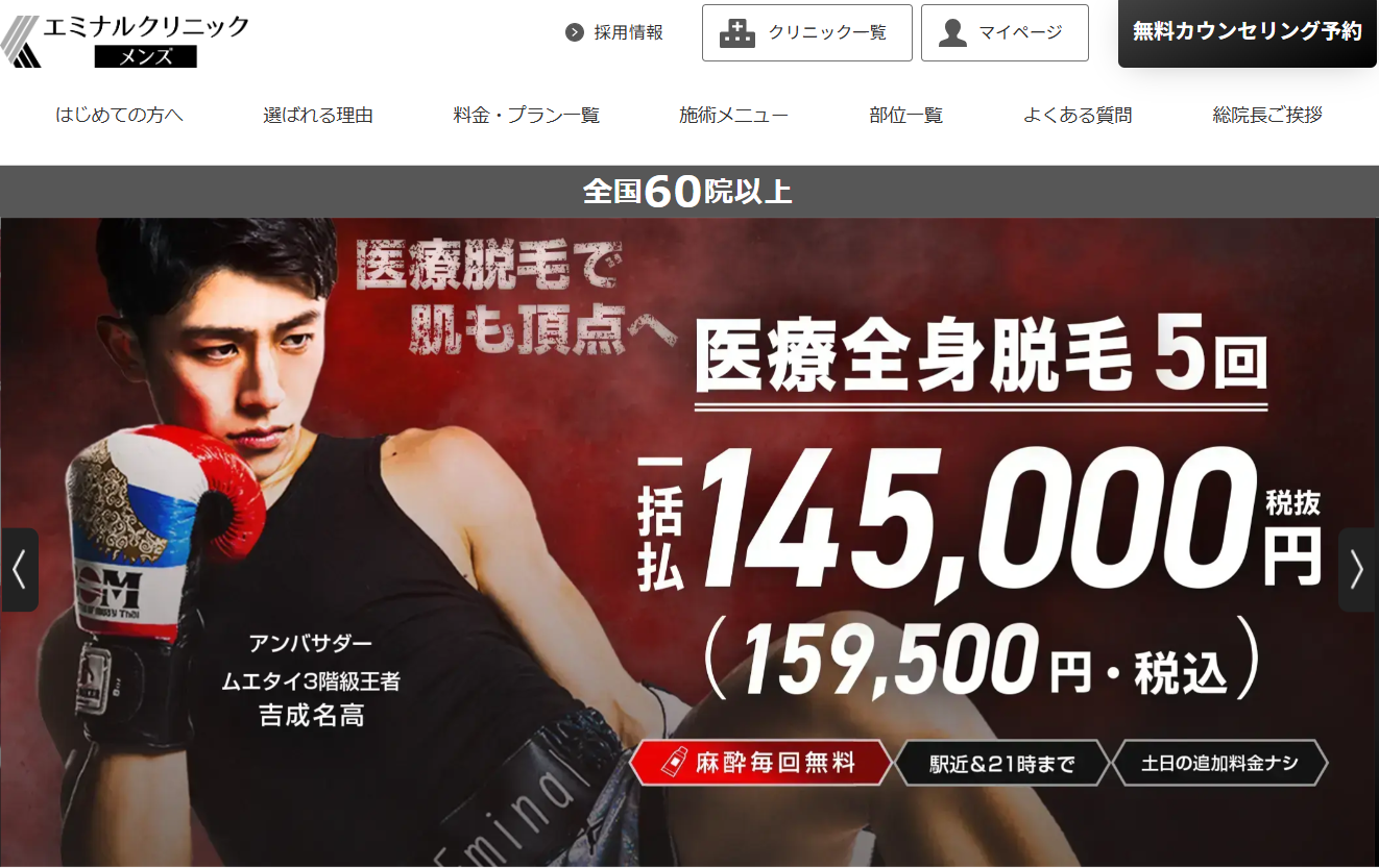 メンズエミナルは、男性専用のクリニックです。低価格・短期間での施術を目指し、少しでも早く結果が出るように工夫がされています。オプションも豊富なので、脱毛に悩んでいる方も気軽に相談できるでしょう。